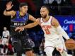 Anthony Black tumbles as Jalen Brunson creates space and knocks down a Knicks 3-pointer.