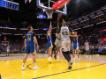 Spurs Stephon Castle gets the rebound and finishes while getting fouled.